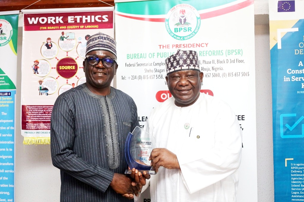 Engr. Abraham Oshadame (left), Executive Commissioner, Technical Standards, Nigerian Communications Commission (NCC), on behalf of Dr. Aminu Maida, Executive Vice Chairman, NCC, accepted a website performance award from Dr. Dasuki Ibrahim Arabi, DG, Bureau of Public Service Reforms (BPSR), on Tuesday, Dec. 23, 2025, at the BPSR office